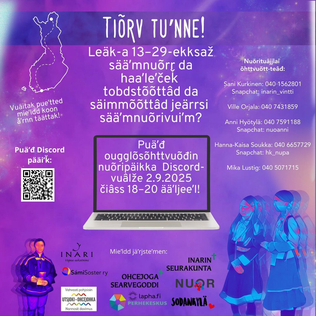 2.9.2025 č. 18-20 ääʹljeeʹl. Vuäitak pueʹtted mieʹldd koon åʹrnn täättas, da leeʹd mieʹldd samai tõn ääiʹj, ko jiõčč haaʹlääk! Tuâjjla lie lääʹdd- da/leʹbe sääʹmǩiõllsa, nuõri ǩiõllsilttõõzzâst jeäʹla õõlǥtõõzz.